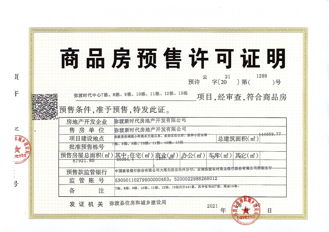 大理市彌渡時代中心7—13棟商品房預售許可證明