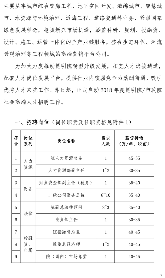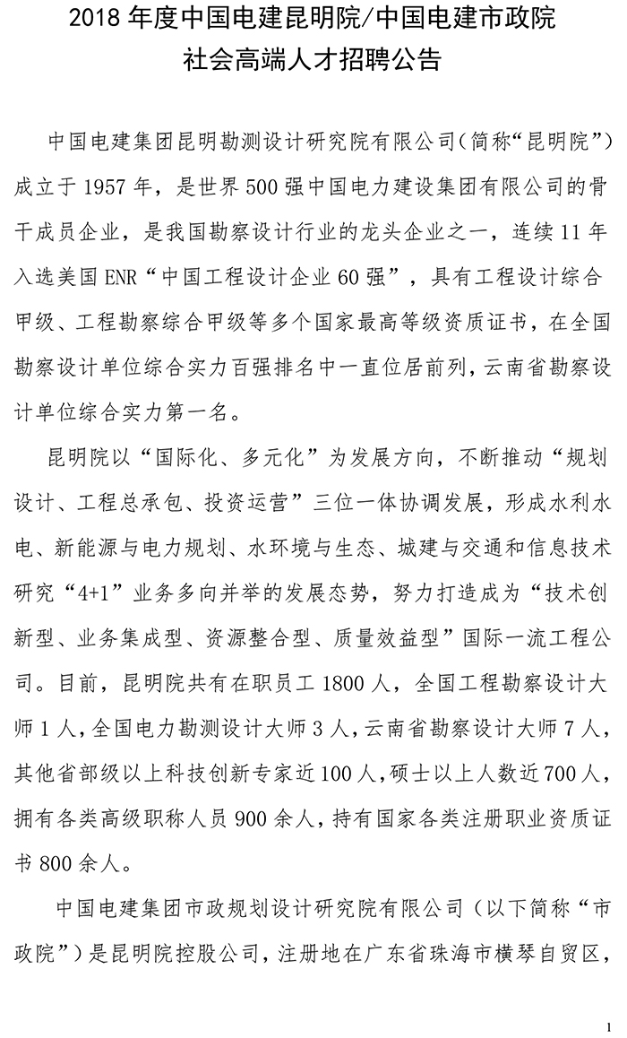 2018年度中國電建昆明院/中國電建市政院社會高端人才招聘公告