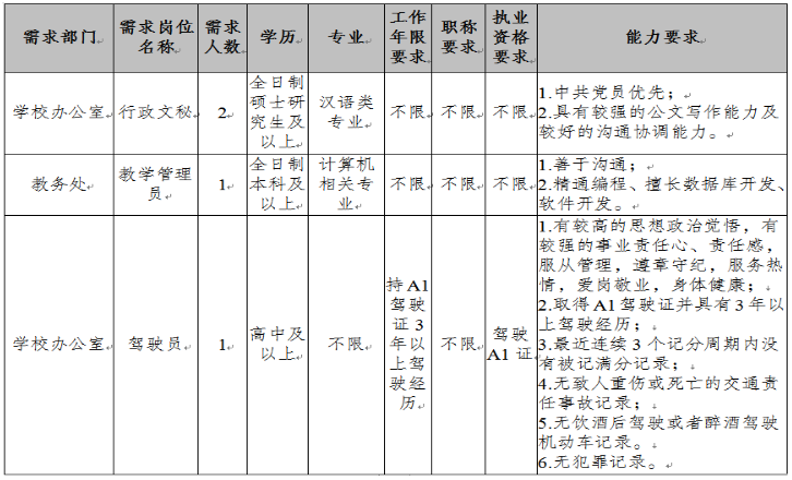 為適應(yīng)學(xué)校發(fā)展的需要,需面向社會(huì)誠(chéng)聘4名工作人員,現(xiàn)將有關(guān)事項(xiàng)公告如下: