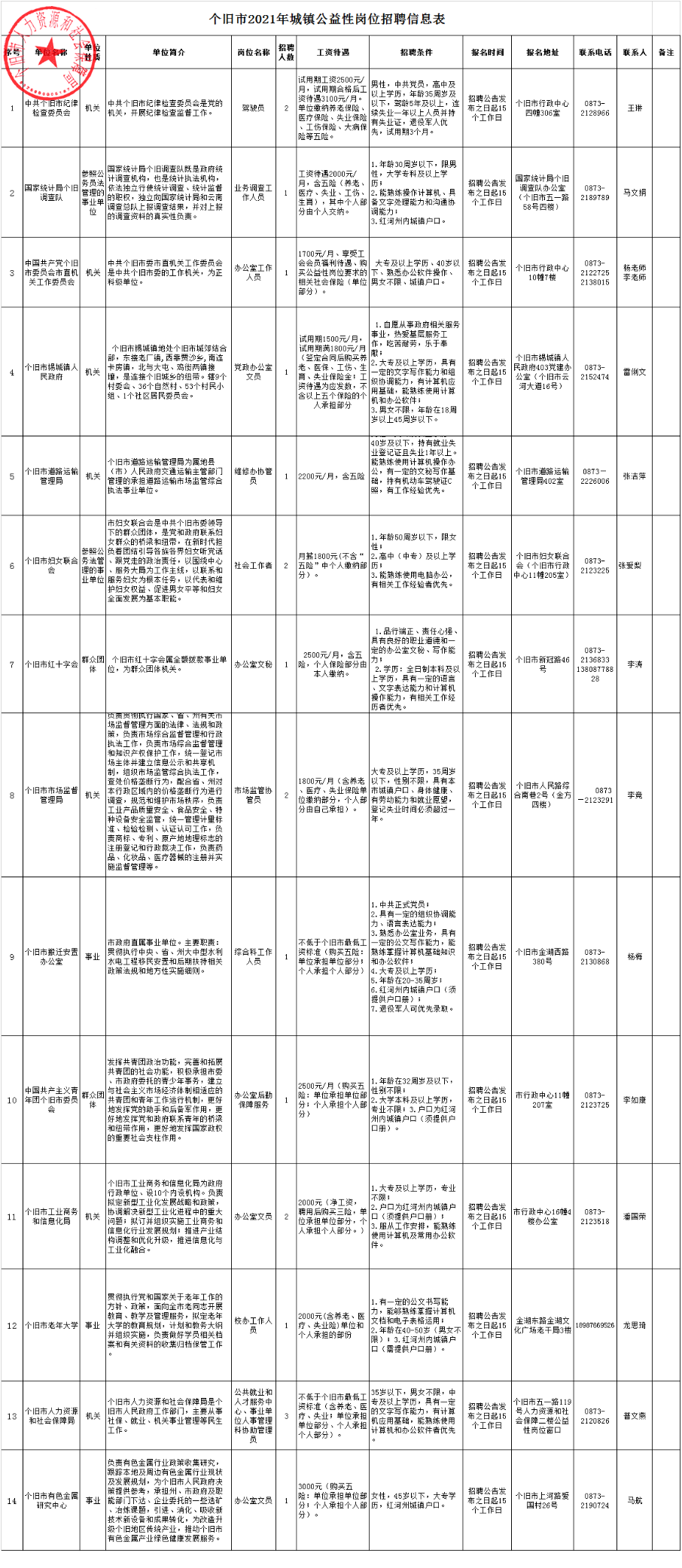 附件:個舊市2021年城鎮(zhèn)公益性崗位招聘信息表.xlsx(下載附件表格或點擊下方信息表圖片查看)
