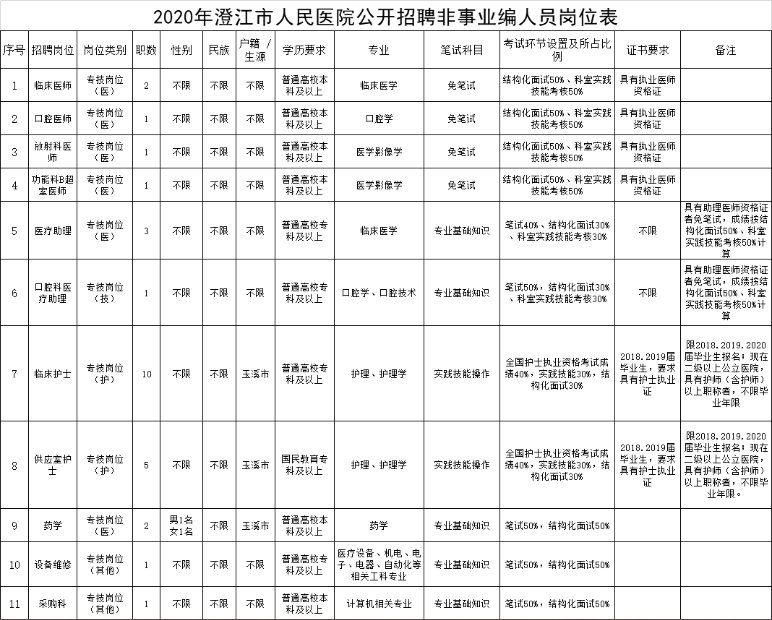 澄江市人民醫(yī)院2020年度面向社會公開招聘非事業(yè)編制工作人員38名。現(xiàn)將第一批招聘28名工作人員有關(guān)事宜公布如下: